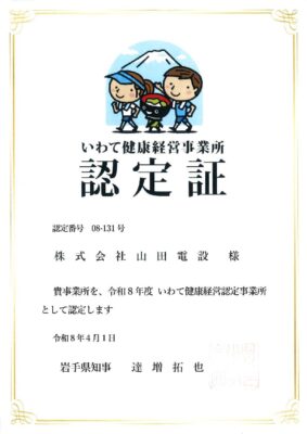 令和8年度「いわて健康経営事業所」の認定をいただきました。今年度より生保会社のサポートを受けながら健康プログラムを導入して、社員の「健康増進・運動習慣の改善」により一層取り組んでまいります。