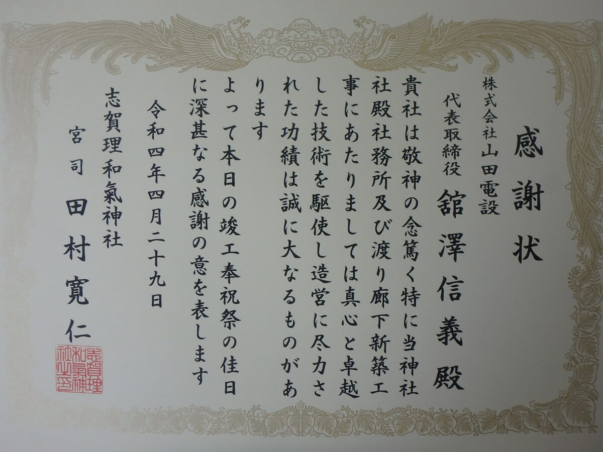 4月29日(昭和の日)に志賀理和氣神社の「社殿等竣工奉祝祭」が斎行され、「社殿」・「社務所」の造営(電気設備工事)に携わり、宮司より感謝状を授与されました。